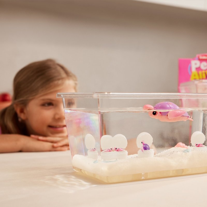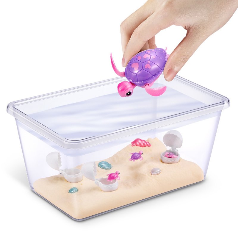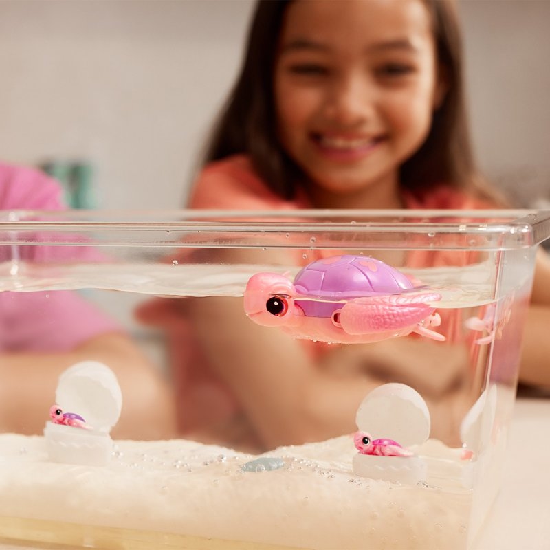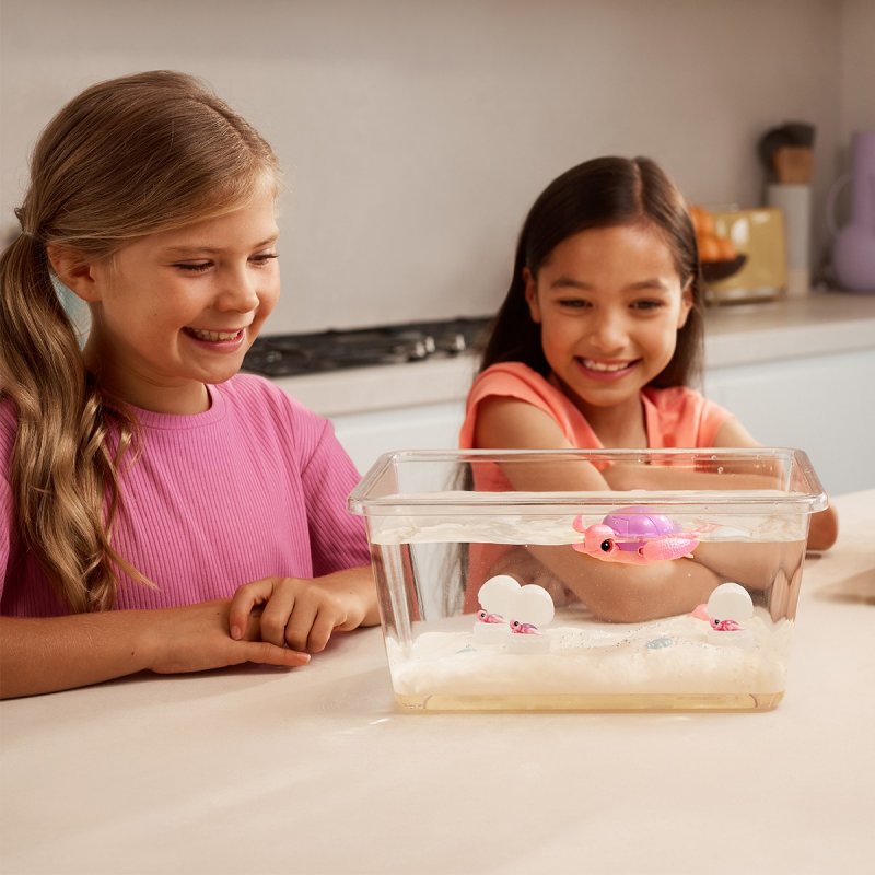 Поиграйте с мамой-черепахой и ее малышами! В «песочной» основе спрятались три яйца — налейте воду в аквариум, и они сами откроются! Сколько маленьких черепах появится на этот раз? Прикрепите их к маме — и вместе отправляйтесь в водное приключение!