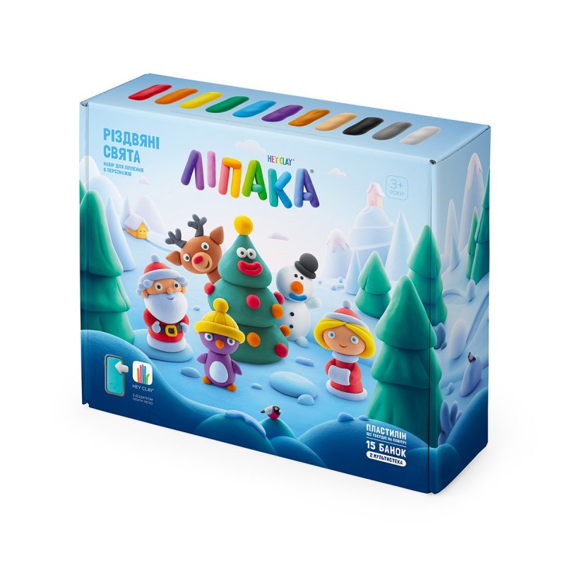 Меганабор самозатвердевающего пластилина ЛИПАКА – РОЖДЕСТВЕНСКИЕ ПРАЗДНИКИ – развлечет и детей и взрослых. С помощью анимационных инструкций в приложении HEY CLAY, Вы сможете слепить 6 уникальных персонажей: Святого Николая, Меланку, Пингвиненка, Ёлку, Оленя и Снеговика. Пластилин твердеет на воздухе за 24 часа, после чего можно играться созданными фигурками.