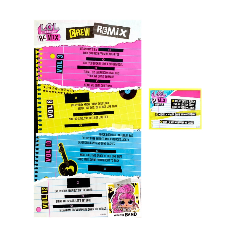 - Лялечки L.O.L. Surprise! вирішили зробити для Вас справжній квест і розділили частини своєї улюбленої пісні між наборами серії “Remix”. Вставте фрагмент тексту на стікері у відповідні прогалини в тексті на аркуші колекціонера, щоб доповнити текст пісні. Тепер Ви можете підспівувати своїм улюбленицям!